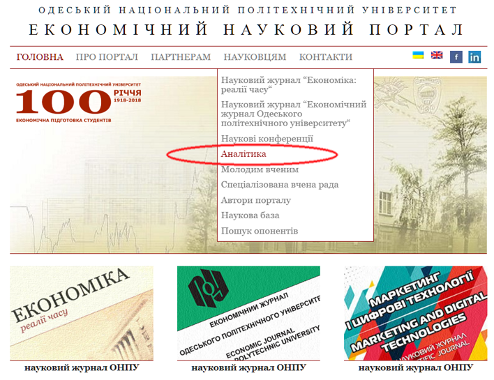 Увага! Новий розділ на порталі! 29 01 2019 Для посилення обізнаності науковців, держслужбовців, підприємців та інших зацікавлених осіб на «Економічному науковому порталі ОНПУ» започатковано практику популяризації аналітичних досліджень наших вчених та партнерів з актуальних питань сучасності: огляд ринків та окремих економічних процесів. Доступ до аналітичних матеріалів у верхньому та правому навігаційних меню: